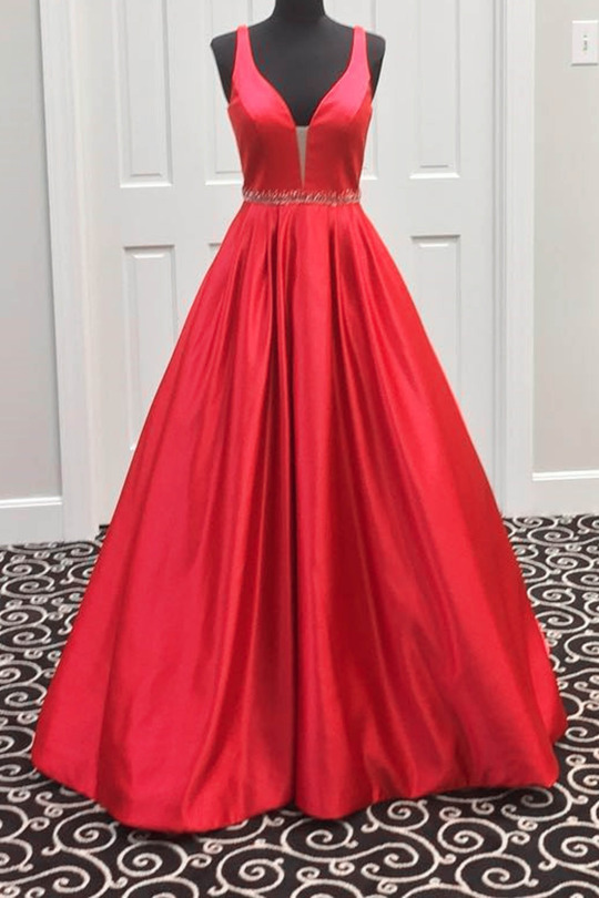 V-neck Long Satin Prom Dresses Floor Length Women Dresses