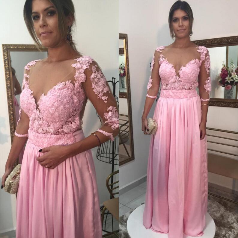 Half Sleeves Pink Chiffon Prom Dresses Lace Women Dresses