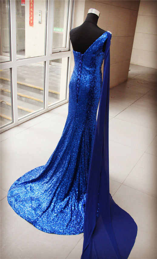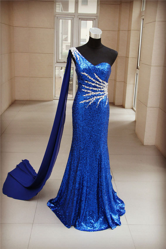 One Shoulder Sequin Lace Prom Dress Crystals Floor Length Women Evening Dress